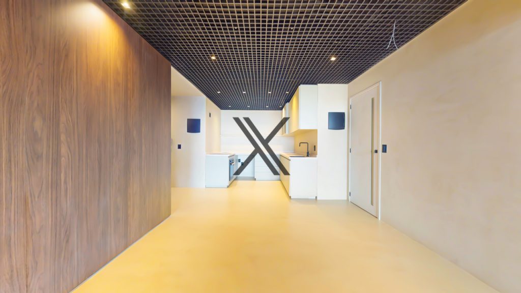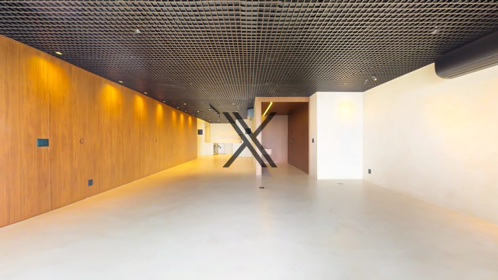 Sua área social é composta por um salão, no conceito contemporâneo, com varanda e cozinha integradas, proporcionando um ambiente amplo, com vista frontal mar, e perfeito para receber amigos e familiares. O apartamento é todo revestido por cimento queimado, com muita harmonia e modernidade com algumas paredes revestidas em madeira.