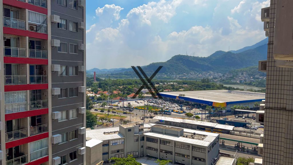 A área social é bem ampla, com uma sala em 2 ambientes e varanda com rede de proteção e vista lateral para a lagoa da Barra.