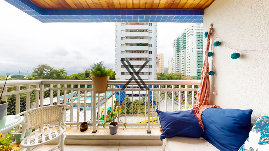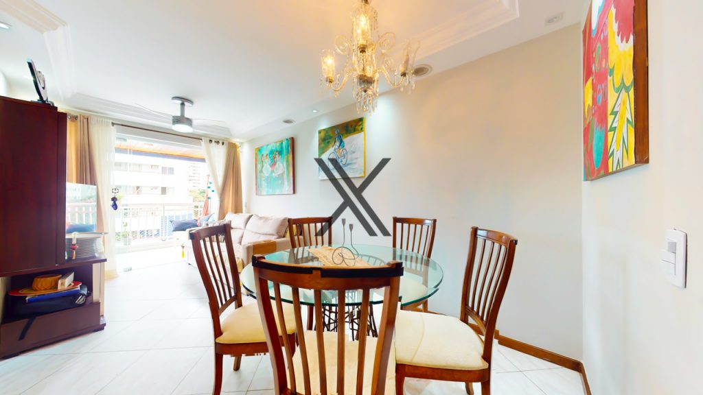 A área social é composta por uma sala em 2 ambientes com armários planejados e excelente varanda com espaço para mesa e banco.