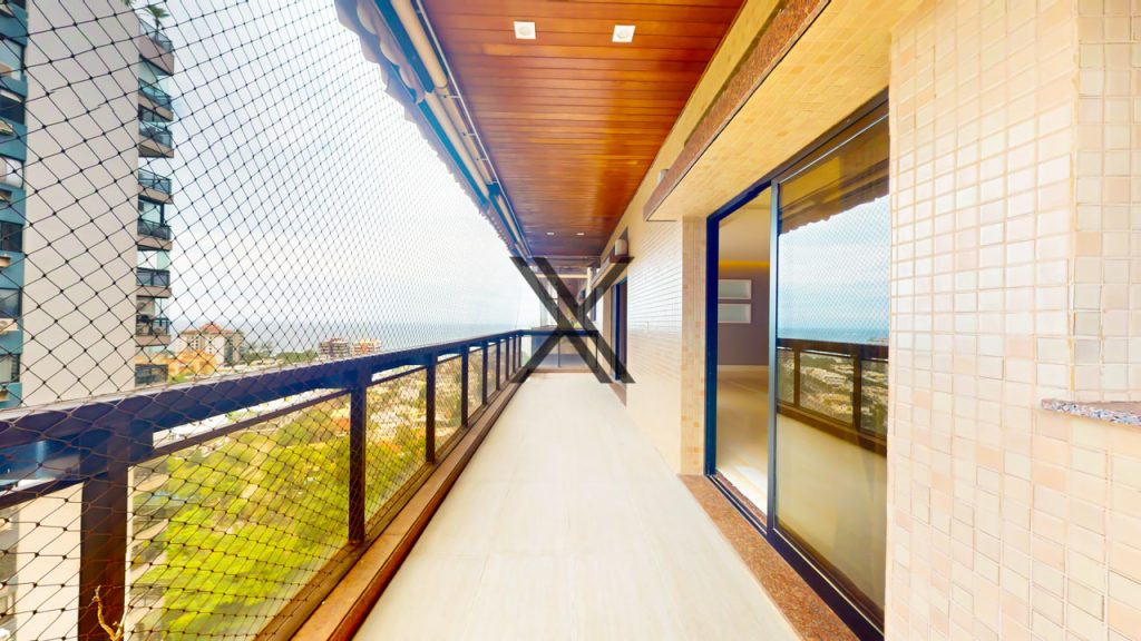 A área social é composta por uma grande sala em 3 ambientes, com ar condicionado split, e uma extensa varanda com com toldos Dias e vista para o mar, para maior privacidade. Um lavabo de apoio às visitas complementa a área.