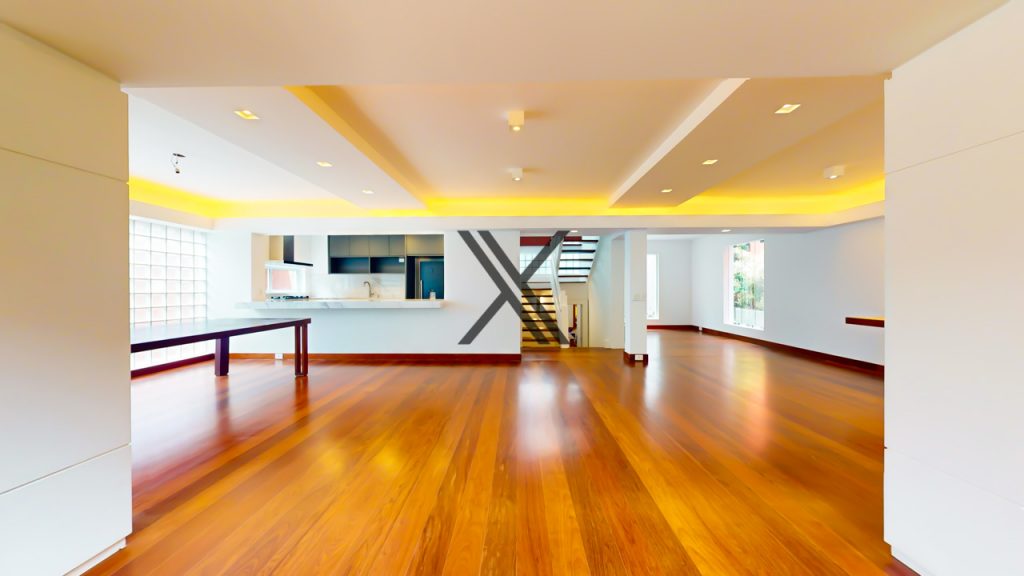O primeiro pavimento apresenta um salão voltado para um jardim interno, com calefator para os dias frios e ar condicionado split, além de 1 quarto que pode ser utilizado como escritório. Um lavabo de apoio às visitas se encontra entre o primeiro e o segundo pavimento.