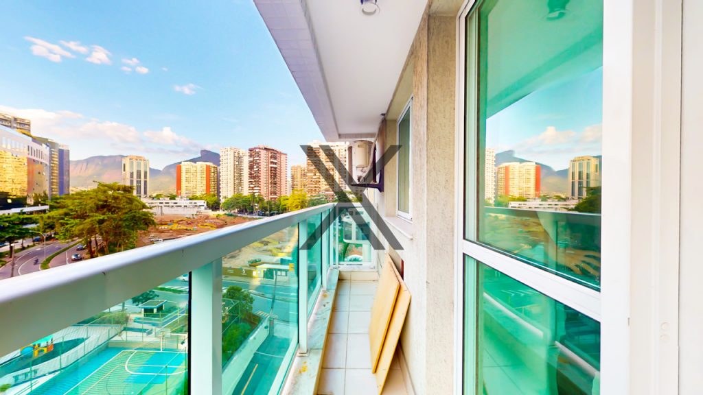 A área social é composta por uma sala em 2 ambientes com ar-condicionado e uma ótima sacada arejada.