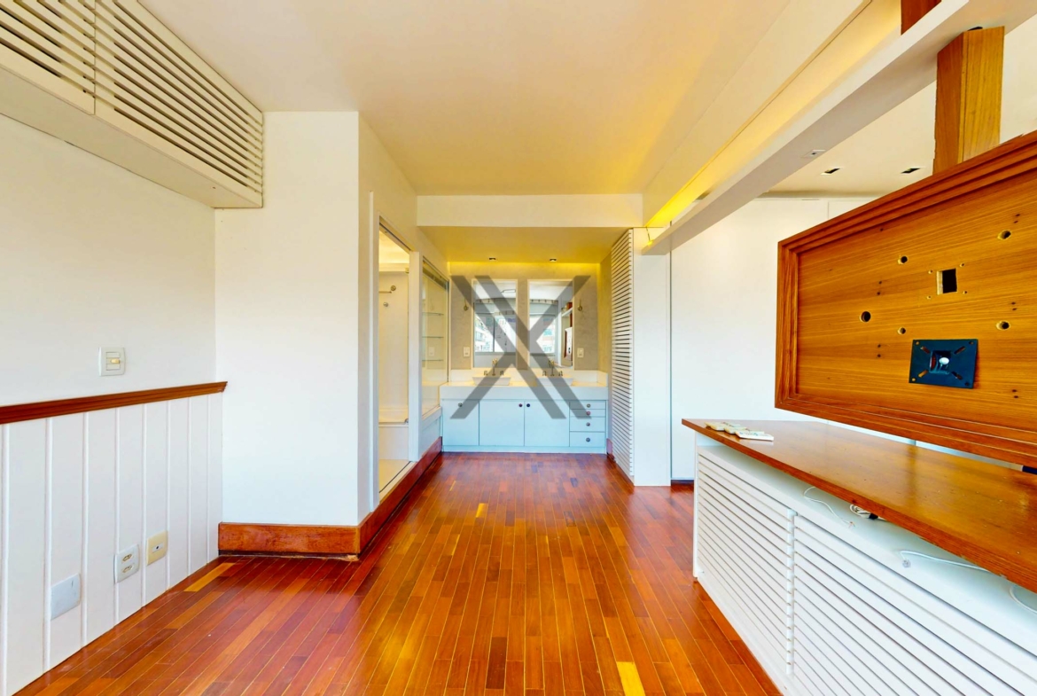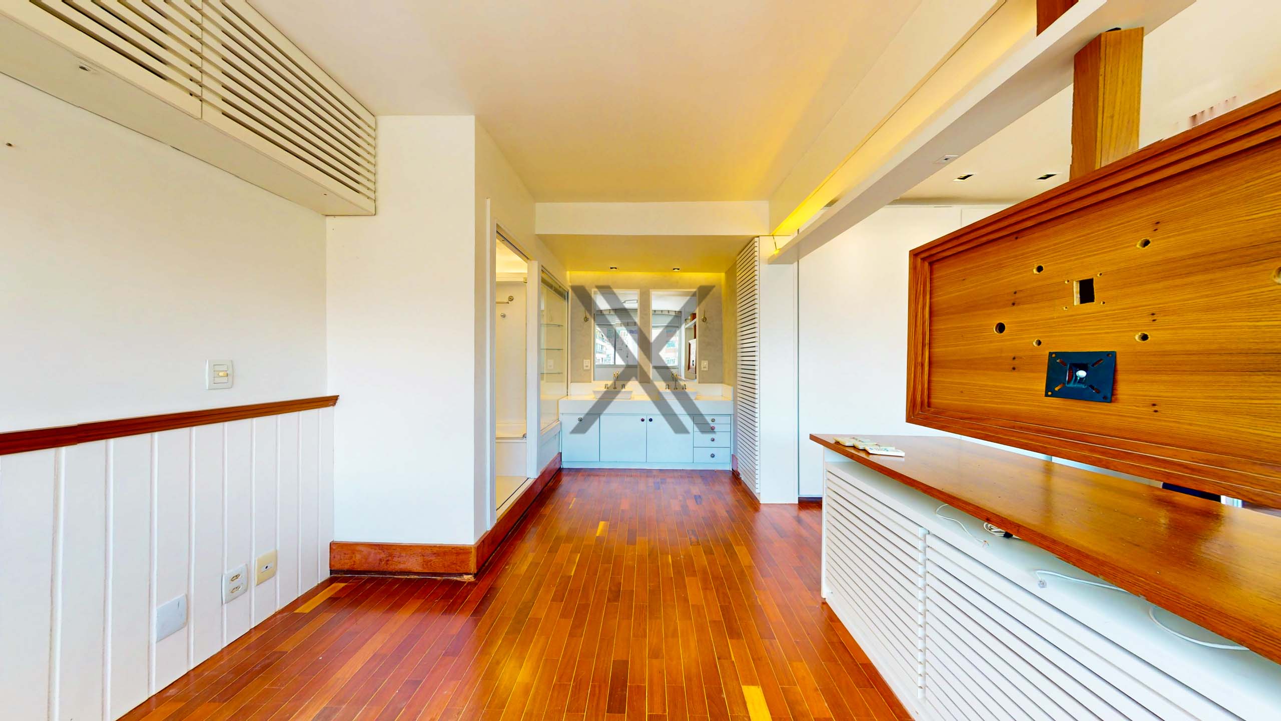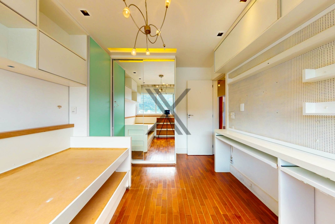 A área privativa conta com 3 quartos, sendo 1 suíte, e um ótimo banheiro social. Todos os cômodos possuem armários, piso em taco, bastante luz natural e bom tamanho. A suíte master é um show à parte, com espaço para walk-in closet além de banheiro em conceito semiaberto, com bancada de pia dupla separada. Originalmente, o imóvel possui 4 quartos, porém um deles foi utilizado para a ampliação da suíte.