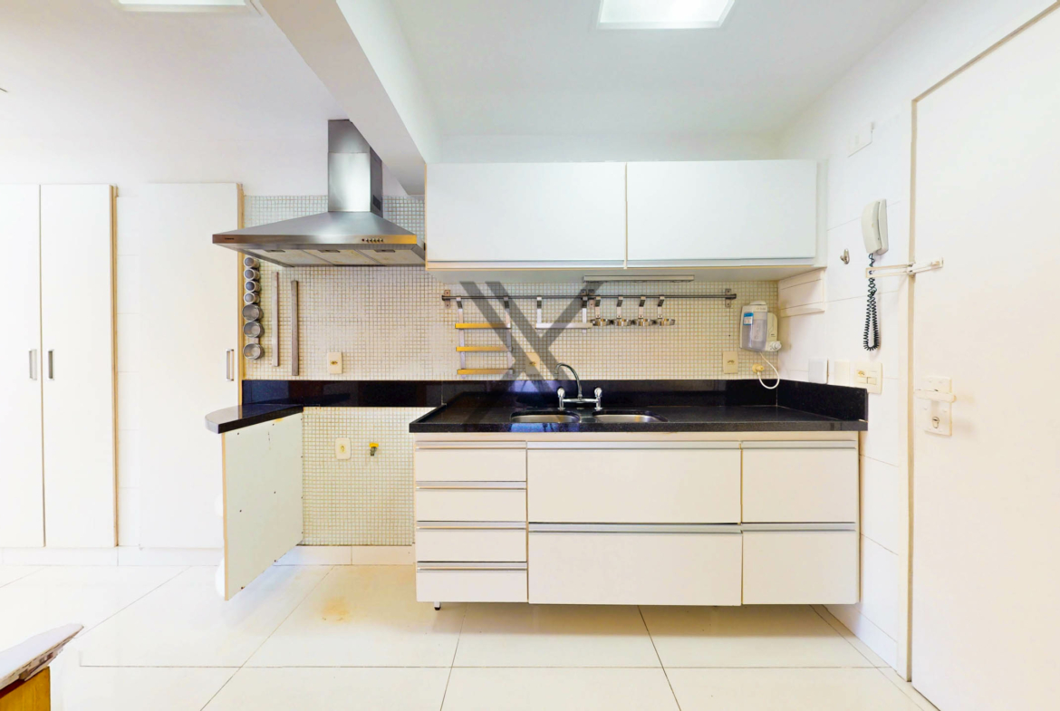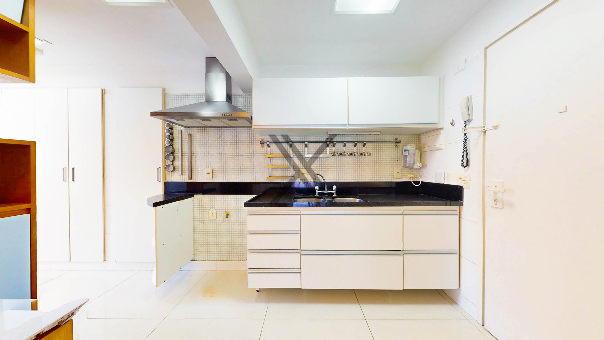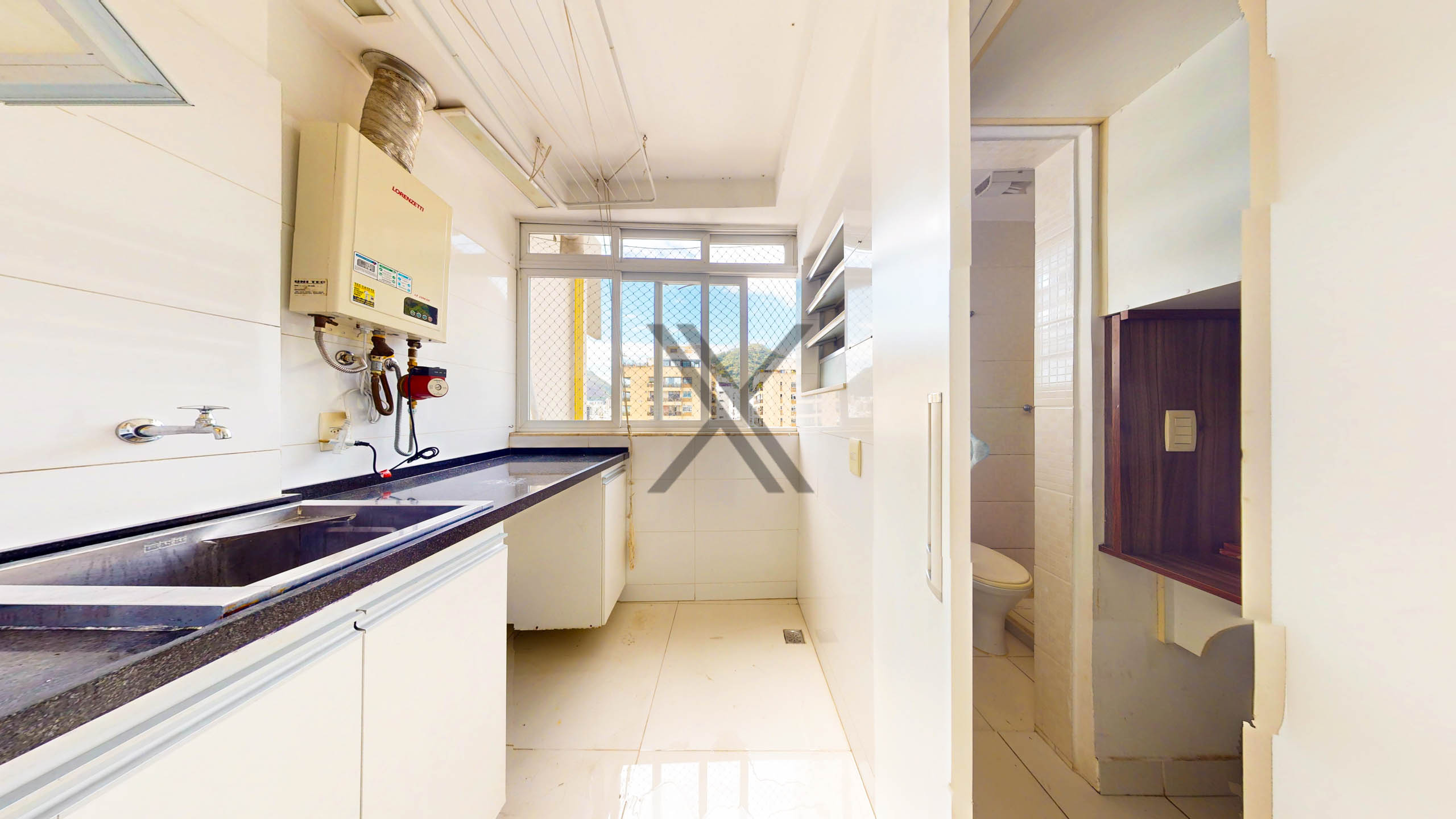 A cozinha apresenta bastante espaço de armazenagem, além de uma copa para a praticidade do cotidiano. Em anexo, está uma ampla área de serviço com lavanderia e a dependência completa para funcionários.