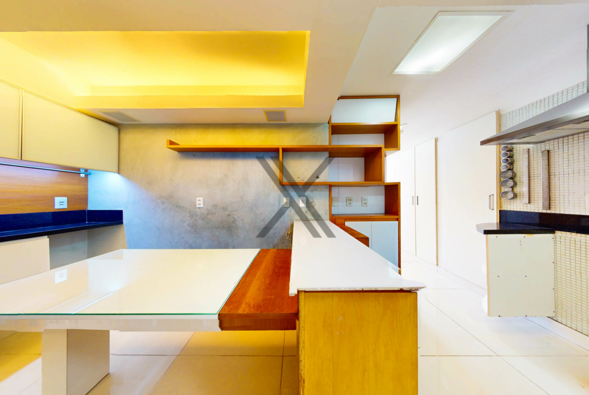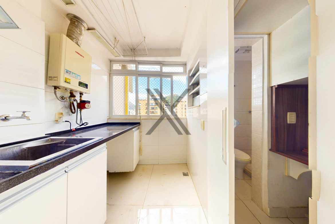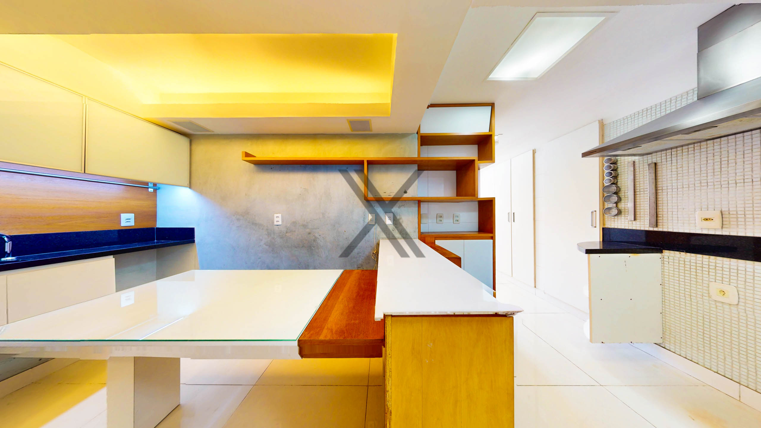 A cozinha apresenta bastante espaço de armazenagem, além de uma copa para a praticidade do cotidiano. Em anexo, está uma ampla área de serviço com lavanderia e a dependência completa para funcionários.