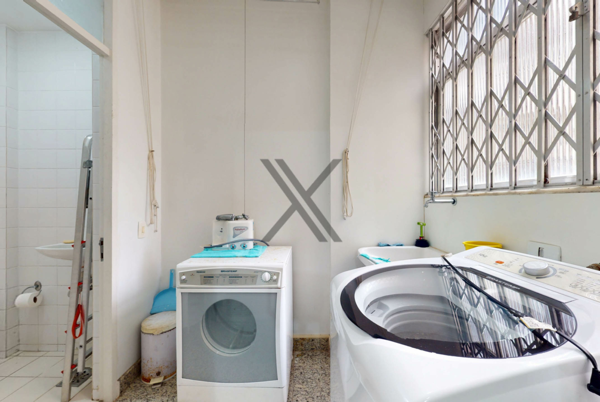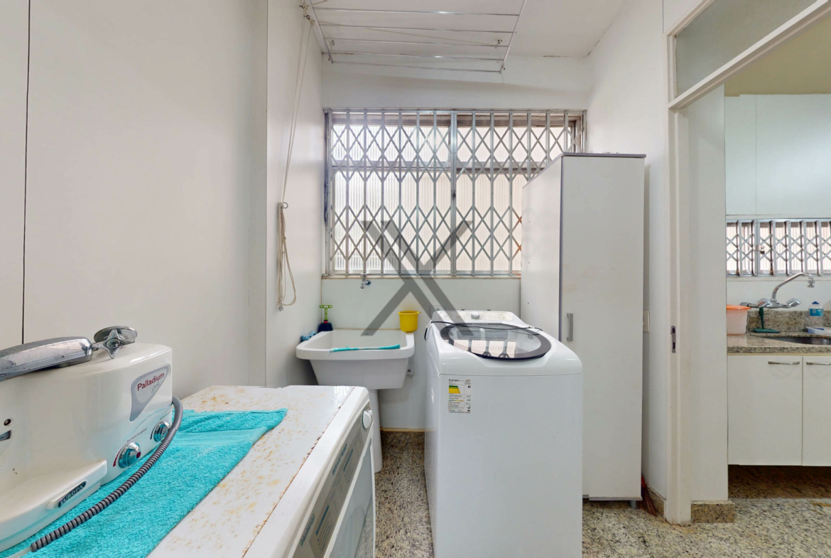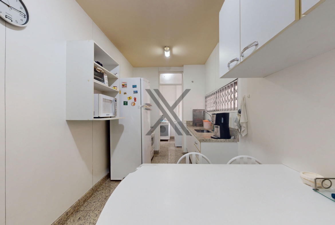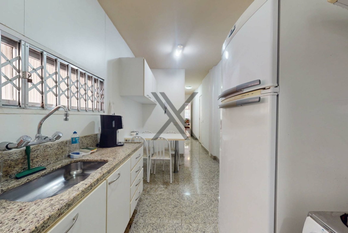 A cozinha é funcional, equipada com armários, bancadas para apoio e organização, além de uma mesa para pequenas refeições. Em anexo, encontram-se a área de serviço e dependência completa para funcionários.